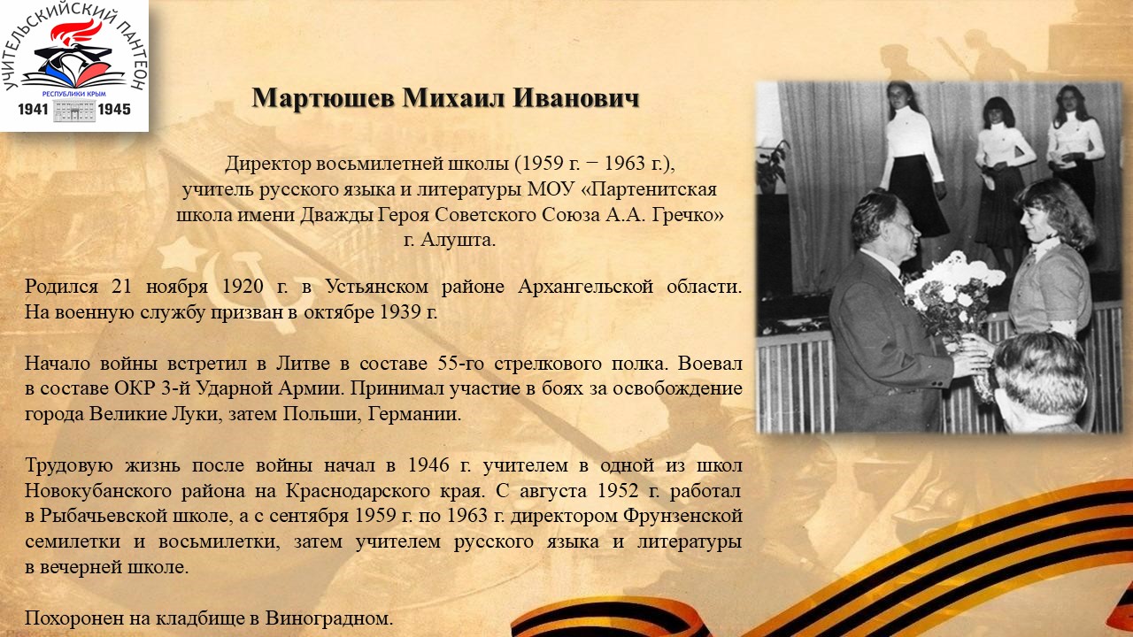 Мартюшев Михаил Иванович Директор восьмилетней школы (1959-1963), учитель русского языка и литературы МОУ «Партенитская школа имени Дважды Героя Советского Союза А.А. Гречко» г. Алушта |
