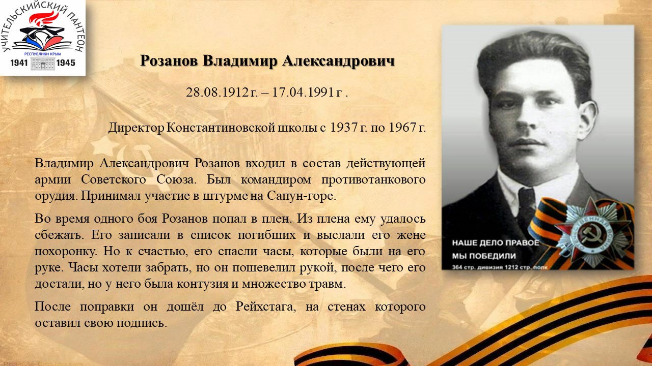 Розанов Владимир Александрович директор (1937–1967) МБОУ «Константиновская школа» Симферопольского района |
