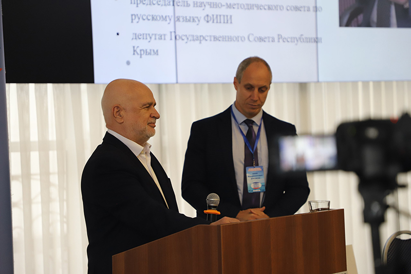 Пленарное заседание традиционно открыл заместитель председателя Оргкомитета А.Н. Рудяков, ректор ГБОУ ДПО РК КРИППО, заведующий кафедрой русского и общего языкознания факультета русского языка и литературы КФУ имени В.И. Вернадского, доктор филологических наук, профессор, член Совета при Президенте Российской Федерации по реализации государственной политики в сфере поддержки русского языка и языков народов Российской Федерации, депутат Государственного Совета Республики Крым. В своем докладе Александр Николаевич рассказал о систематической работе в области поддержки и развития русского языка как государственного, об основных направлениях работы и достижениях крымских русистов, а также поделился новостью о своем назначении председателем Научно-методического совета по русскому языку Федерального института педагогических измерений.