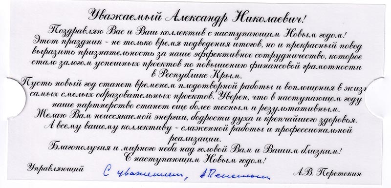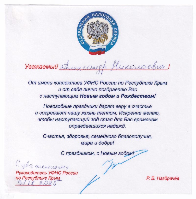 Поздравления с Новым годом и Рождеством ректору Института А.Н. Рудякову