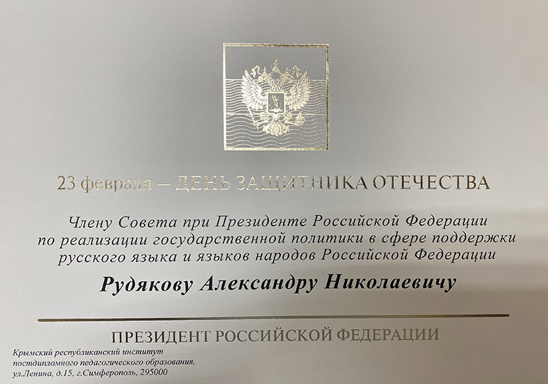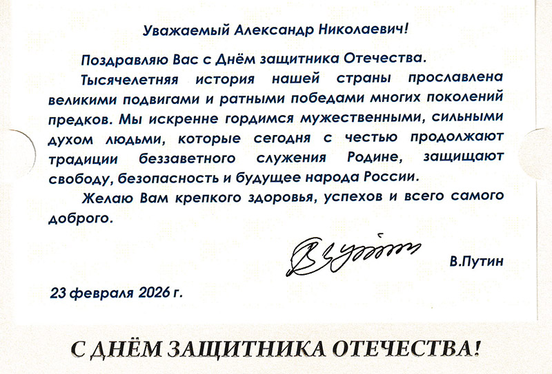 Поздравление с Днем защитника Отечества ректору Института А.Н. Рудякову от Президента Российской Федерации В.В. Путина