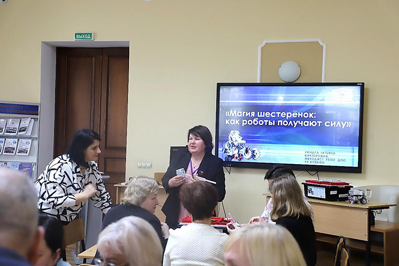 - «Магия шестерёнок: как роботы получают силу» Татьяна Викторовна Киндра, методист ЦЕНМО ГБОУ ДПО РК КРИППО, наглядно продемонстрировала, как робототехника позволяет изучать физику, математику и программирование в игровой форме, способствует развитию инженерного мышления. (Ссылка на материалы мастер-класса по робототехнике https://cloud.mail.ru/public/v48h/Qci4VXUuc )